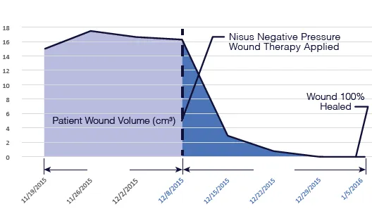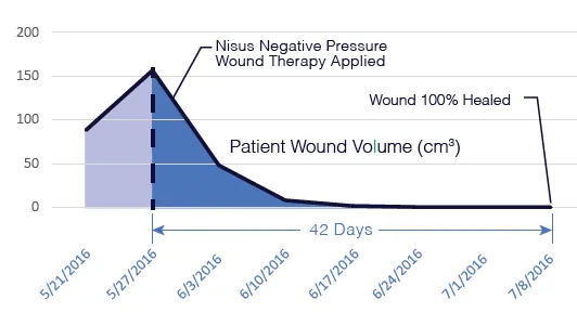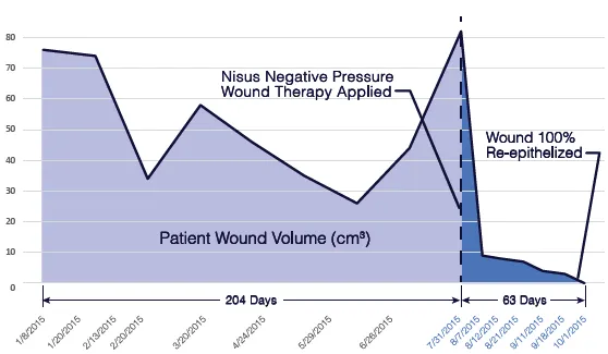 pulses, via Doppler. Patient underwent an emergent re-vascularization of the left leg. Post procedure a skin substitute was placed. Between 02/20/15 to 07/31/15 patient underwent multiple excisional debridement’s and several modalities of treatment with no wound improvement. Amputation of left lower extremity was considered. On 07/31/15 the Nisus NPWT wound system was applied. On 08/07/15 wound showed marked improvement and appeared with 10% percent necrotic tissue and excisional debridement performed. Between 07/31/15 to 09/18/15 patient modality of treatment was Nisus NPWT wound system, patient had 2 more excisional debridement’s for small clean-up of necrotic tissue. On 09/18/15 The Nisus NPWT wound system was DC secondary to wound is 100 granulated and is ready for re-epithelization.